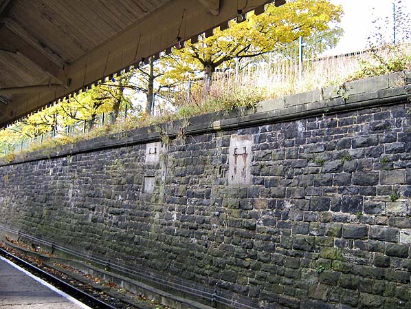 ![]() The areas of concrete set into the sandstone wall had held brackets that supported signals that controlled trains in both directions at Bury Bolton Street station's platform 4. Photo by Danny Jones