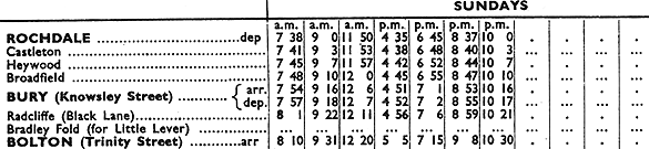 From 17 February 1916 a frequent service of electric trains was introduced between nearby Bury Bolton Street and Manchester Victoria. The intensive service resulted in Bacup - Manchester Victoria trains being diverted to run via the Bury East Fork and Bury Knowsley Street. Although this added considerable mileage to those services it provided Knowsley Street with a frequent direct service to Manchester Victoria. The July 1922 timetable showed 10 trains from and 8 trains to Bacup Monday-to-Friday. On Saturdays there was an extra train to and from Bacup. The LMS Summer timetable for 1932 showed 26 up and 24 down services Monday-to-Friday. On Saturdays during the summer a number of holiday trains ran to and from Llandudno Junction. The last LMS summer timetable was published on 16 June 1947. It showed 30 up and 27 down services Monday-to-Friday. Ten of the services in each direction were Bacup line trains. On Saturdays there were 32 up and 30 down trains. Twelve of the up and 9 of the down services were Bacup line trains. The Sunday service consisted of 10 up and 11 down trains. Four of the up services originated from Bacup and 3 of the down services went there.