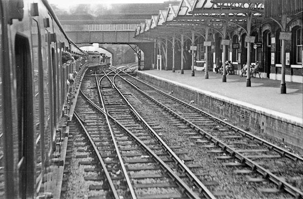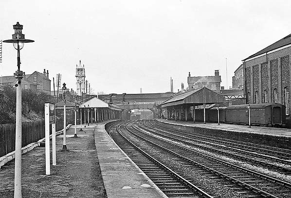 ![]() Looking west along the down platform of Bury Knowsley Street station on 17 February 1962. The street level entrance and booking office can be seen in the distance to the right of the line. To the right a rake of parcels vans can be seen in the up side bay platform. By this time the hipped ends of the canopies have been replaced with vertical boards.