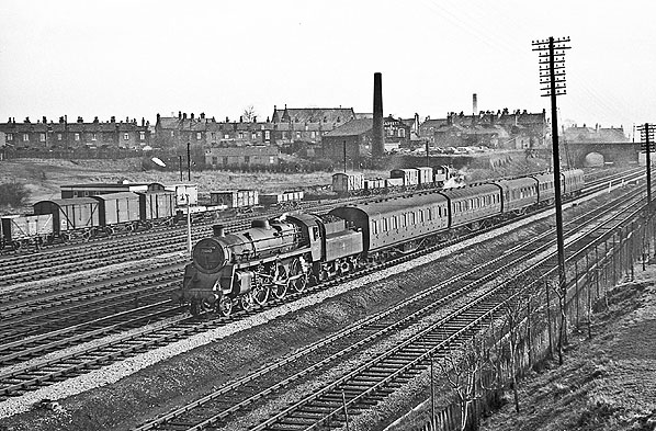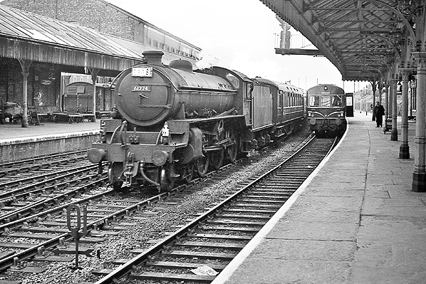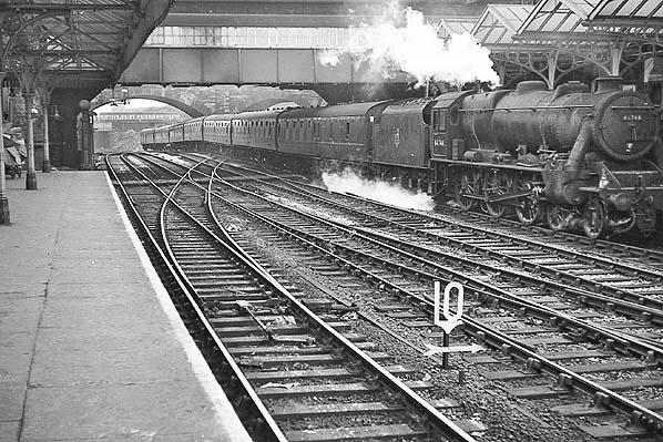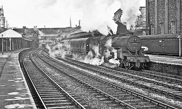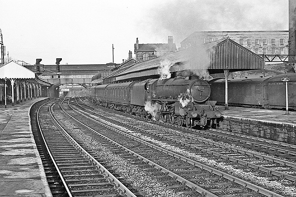 Photo by Richard Greenwood ![]() With 4-6-0 Stanier 5MT locomotive (Black 5) number 45101 at its head a Liverpool Exchange to Rochdale service waits to depart from Bury Knowsley Street on 17 February 1962. The locomotive had entered service with the LMS in May 1935. When this view was taken it was based at Newton Heath. Photo by Richard Greenwood ![]() The west end of Bury Knowsley Street seen on 26 May 1962. A Southport Chapel Street to Rochdale service is seen arriving at the up platform. The dip in the Bolton – Castleton line at Bury, which allows it to pass under the Manchester – Bury line, is clearly shown in this view. The footbridge is a 1953 replacement made necessary following the catastrophic collapse of the nineteenth-century structure on 19 January 1952 (click here to read more about the footbridge collapse).