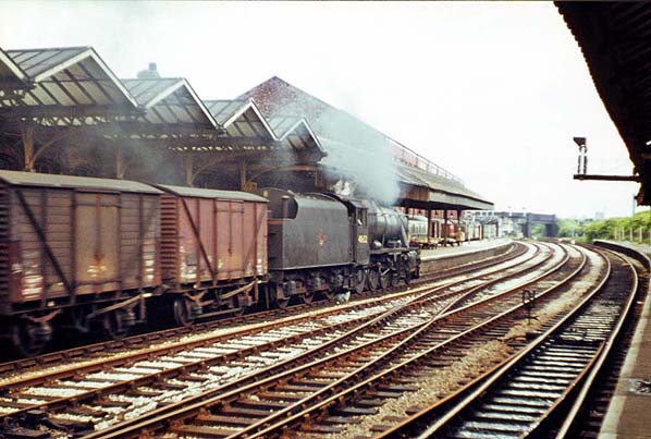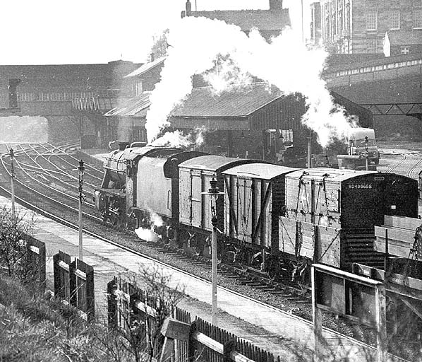 ![]() At 18.35 on 10 May 1966 a westbound freight train is seen passing through Bury Knowsley Street station on the down through line. The goods yard behind the up platform can be seen to the right.