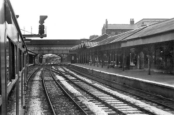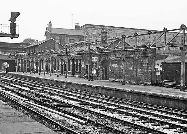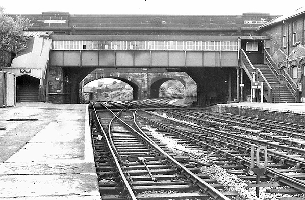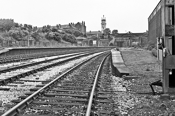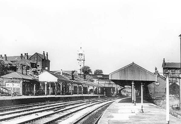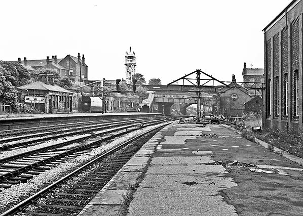 ![]() Looking west at Bury Knowsley Street from a Rochdale to Bolton service on 16 September 1969. Despite having only a local service of DMUs the station still has the appearance of a main line facility. That would all change within eight months when features the canopies would be removed