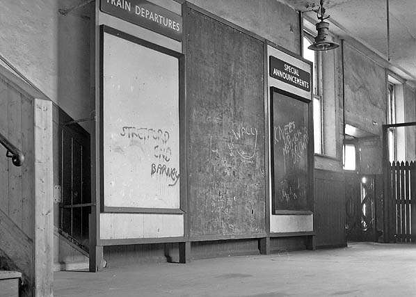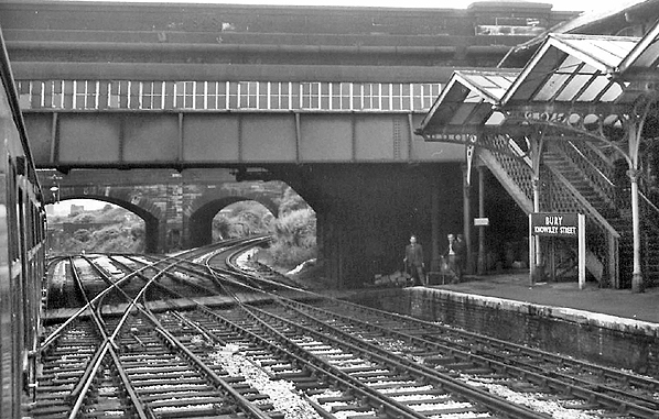 Photo from the Jim Lake collection ![]() Bury Knowsley Street station looking south-east from the street in 1970. Photo from the Ted Burgess collection ![]() Photo from the John Mann collection ![]() A view from the summer of 1970 looking west at the BR(LMR) footbridge erected in 1953 after the LYR structure had collapsed on 19 January 1952 (click here to read about the Bury Knowsley Street footbridge accident). Photo from the Courtney Haydon collection ![]() Bury Knowsley Street station looking west in the summer of 1970. Photo from the John Mann collection ![]() The up platform of Bury Knowsley Street in the summer of 1970. The canopy was in the final stages of demolition making the station appear disused when it fact it still had a frequent service of passenger trains. Photo from the John Mann collection ![]() The unwelcoming interior of Bury Knowsley Street station in 1970. Photo from the John Mann collection ![]() Looking west along the up platform in the summer of 1970. Photo from the John Mann collection ![]() Photo from the John Mann collection