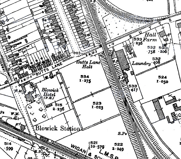 Notes: Butts Lane Halt was located on the former Liverpool, Southport & Preston Junction Railway (LSPJR) Barton branch which had originally opened on the 2 September 1887. Since the 15 July 1897 the line had been part of the Lancashire & Yorkshire Railway (LYR).