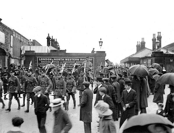 A platoon of soldiers march along the roadway between the L&NWR station (on the left), and the Midland station (on the right), on a wet day during the Great War. Photo from Rowsley Association