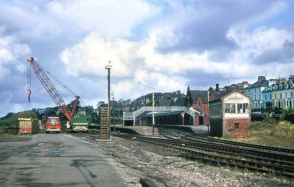 ![]() Caernarvon station looking north in the summer of 1970. The line had closed in January 1970 but re-opened on 15 June 1970 for Freightliner services following the fire on the Britannia Bridge. The picture shows a Freightliner container being loaded onto a lorry. Freighliner trains used the station until 5 February 1972 giving it a slightly longer life than had been intended by British Rail. Photo by Ken Robinson ![]()