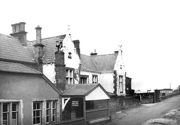 Caernarvon station seen from the Bangor road in 1969. The white painted part of the building was the original station of 1852. It was extended over the years most notably in 1894.