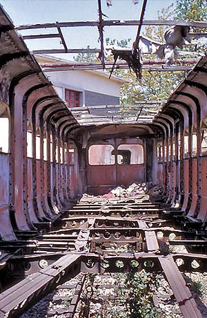 What is left of the railcar's interior is seen left and is looking towards the rear of the car. Note the thin section of the underframe members and the holes to help reduce weight further