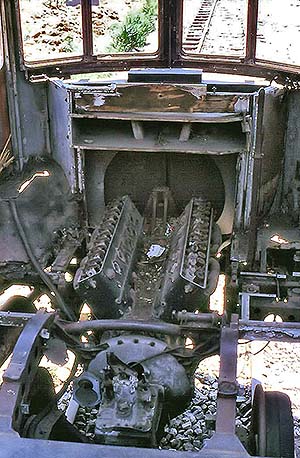 The final picture (right) shows the railcar engine, or what is left of it, in its position mounted on the underframe. This is the V12 engine which, for all intents and purposes, superceded the bogie-mounted 12 cylinder horizontally opposed Type 86 unit. When complete, the V12 would project well up above floor level and would be covered by a cowling which curved downwards over the engine. The driving position was to the right of the engine and in the foreground part of what remains of the transmission can be seen.