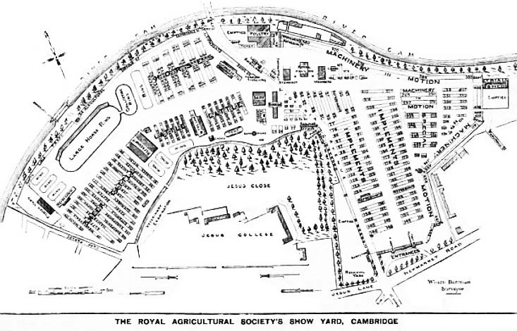 This plan of the showground dates from 15 June 1894, eight days before the show opened to the public. Unfortunately it is difficult to read but at least it has survived and is the only known plan of the 1894 show. The River Cam forms the northern boundary to the site, which is bisected by Victoria Avenue. West of Victoria Avenue is Jesus Green and right thereof is Midsummer Common.