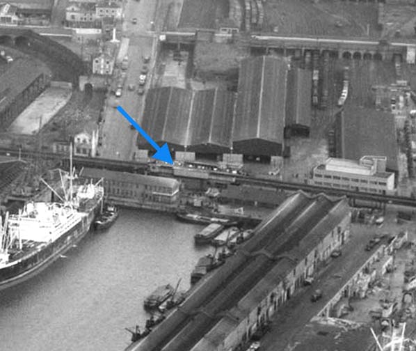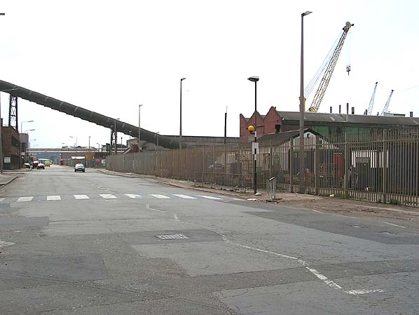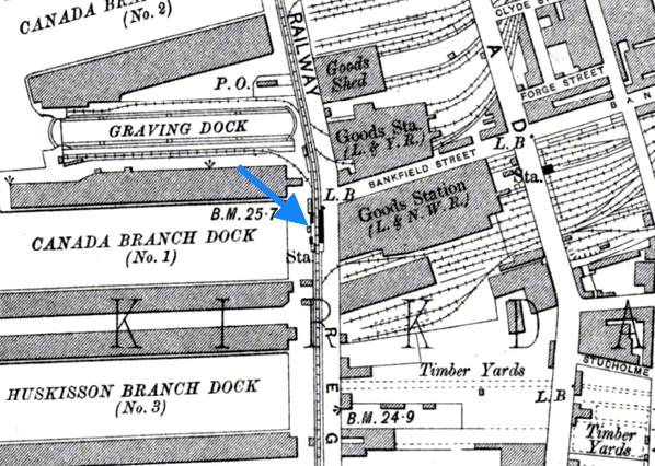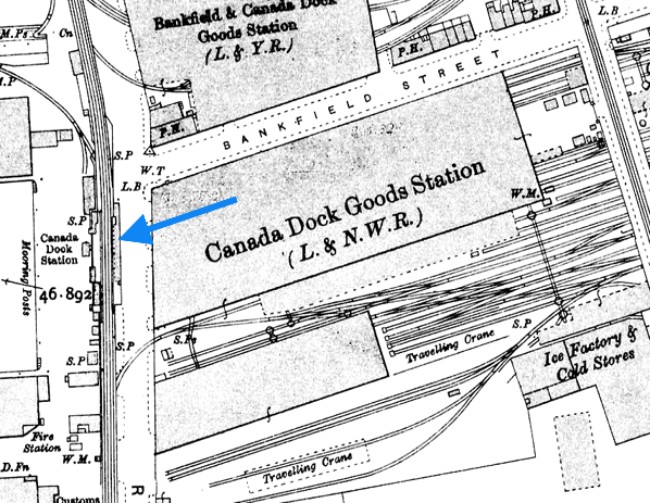 Notes: The Liverpool Overhead Railway (LOR) opened on 6 March 1893 and Canada Dock was one of the original stations of a five mile line that ran between Herculaneum Dock and Alexandra Dock. The LOR was an elevated railway track level being 16ft above the street. The line was carried on an iron deck supported on iron pillars. By the late 19th century the Liverpool dock system had become so congested that a passenger railway was required and the LOR was built to meet that need. From the start it was an electric railway using three coach electric multiple units that collected their current from a live rail laid in the centre of the running rails.