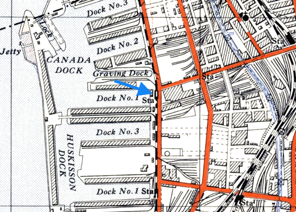 Canada Dock station was on the west side of Regent Road on the east side of the dock system. To its east was the Canada Dock Goods Station of the London & North Western Railway (LNWR) which had opened on 15 October 1866. In common with the other stations on the line Canada Dock was elevated above the street and had the Mersey Docks & Harbour Board (MD&HB) railway running underneath. Passengers accessed the station by stairways located at each end of the station. There were two platforms and shelters were provided on both. Ticket facilities were located on the platforms.