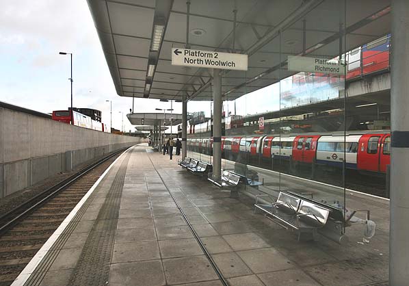 Canning Town Station looking south in December 2006 - a Jubilee line train can be seen to the right with a DLR train above
