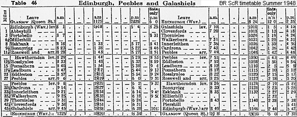 After WW2 came nationalisation, and passenger numbers continued to fall dramatically. By 1951 the service had been reduced to three daily trains between Edinburgh and Galashiels with two additional trains on Saturdays. The former Caledonian line between Peebles and Symington closed to passengers from 5 June 1950; three months later the former NBR station was renamed Peebles East with the now goods-only former Caledonian station becoming Peebles West.