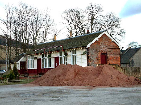 Later that year the NBR submitted proposals for a new station building and a platform extension which would involve some realignment of the siding. The new single-storey station building was of brick with a pitched slate roof and a weather-boarded front facing onto the platform. The small building comprised the booking office and ladies’ waiting room with a gents’ toilet the west end. The new building obstructed the view from the |