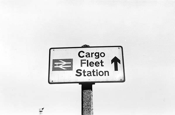 Cargo Fleet station sign at the end of the footpath leading to the passenger subway