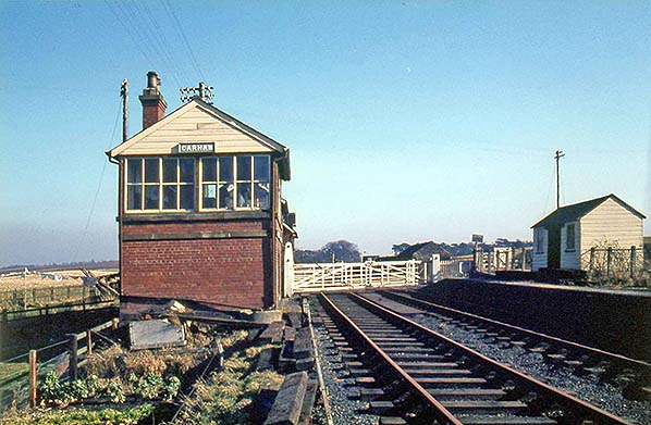 Carham Station Gallery 2: cWinter 1963/4 - March 2014 ![]() Carham signal box and the north-eastern end of the down platform with a timber-built store, seen probably in winter 1963-64.
