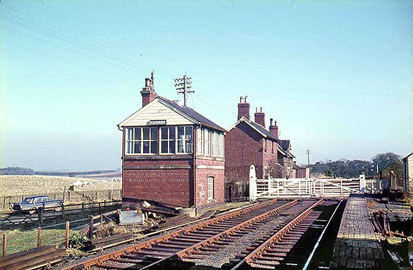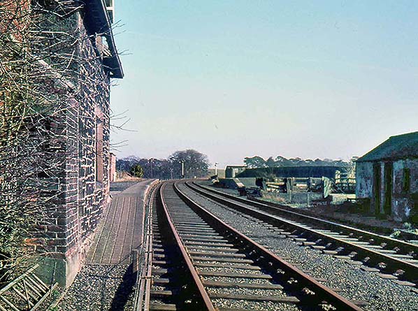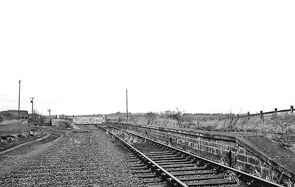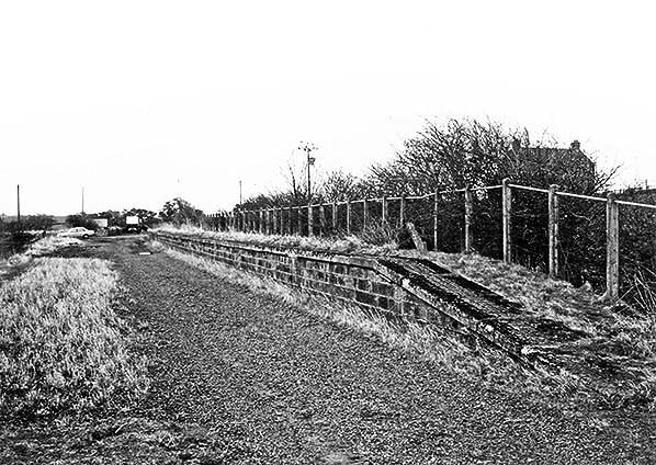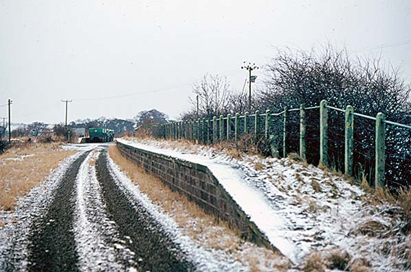 ![]() The up platform at Carham, looking north-east, with the stationmaster’s house left foreground. The former goods loading bank in the distance is set well back from the down line as it was served by a siding, now removed. The photo was probably taken in winter 1963-64.