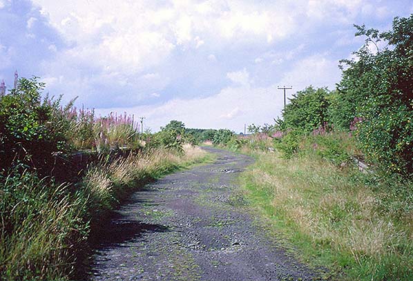 Photo by John Mann ![]() Looking north-east at Carham station in August 2001. The up platform is to the left and the goods loading bank to the right, both covered by a thick mat of vegetation.
