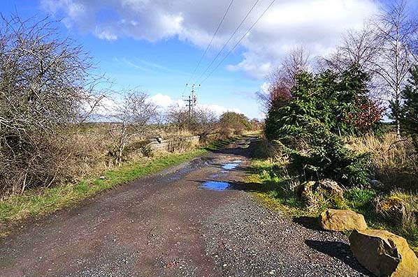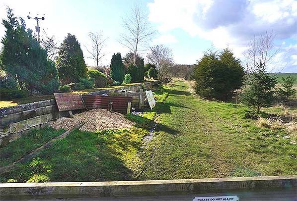 Photo by Bruce McCartney ![]() Looking north-east from the level crossing at Carham station in March 2014. The up platform is on the left. Conifers have been planted on or adjacent to the goods loading bank.