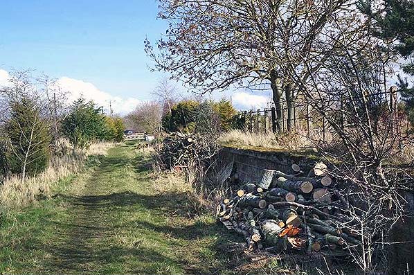![]() Looking north-east along the trackbed at Carham station in March 2014. The down platform is to the right. Some tree-felling has taken place probably in connection with the development of attractive planting on the formerly derelict and overgrown platform.
