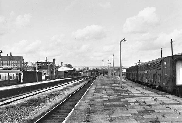 Carmarthen station looking north-east from the island platform in July 1974. All the buildings on this platform have been demolished and the footbridge has been removed. Passengers now have to use the barrow crossing at the north end of the station to reach the platform. The middle through line