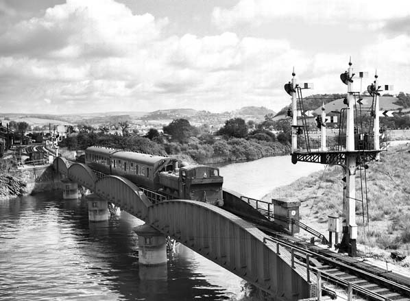 Class 0-6-0PT 7439 crossing the River Towy as it approaches Carmarthen station with the 11.15am passenger service from Llandilo in August 1962. 7439 was built at Swindon works in October 1948 to a design by C.B.Collett. It spent all of its working life of 16 years in Wales, when it was withdrawn from 87F, Llanelly shed in April of 1965 to be scrapped at Birds, Bynea in August of that year. A class of 50 locos, 7439 was the last to be withdrawn and none are preserved