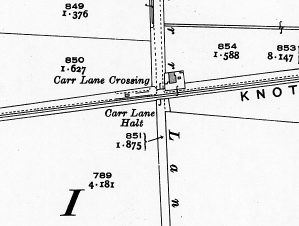 Notes: Carr Lane Halt first appeared in the Bradshaw timetable in July 1921 but it had probably opened when the Knott End Railway (KER) Company introduced a railmotor service onto the 11½ mile Garstang &Catterall – Knott End railway in the summer of 1920 (Click here to see an OS quarter-inch scale map of the line as it was in 1920). The KER had been formed to extend the 7 mile Garstang& Knot (sic) End Railway (G&KER), which had opened on 5 December 1870, from Pilling to Knott End. Authorised on 12 August 1898, the 4½ mile KER line had opened on 30 July 1908 with one intermediate station at Preesall. The KER had purchased the G&KER on 1 July 1908.