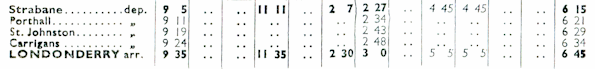 The working timetable of September 1961 showed a reduced service to Carrigans. In the up direction there were two passenger trains on a Monday. Tuesday-to-Saturday there were two ordinary passenger trains and one mixed passenger/goods train. All of the Up services ran to Strabane. In the Down direction there were two passenger trains Monday-to-Friday. On Saturdays there were three, the last of which ran late in the evening. There was also a Down morning goods service that ran from Strabane to Derry/Londonderry and was booked to call at Carrigans Monday-to-Saturday.