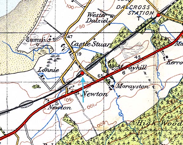 Notes: The halt was opened to serve Castle Stuart, ancestral home of the Earls of Moray and is now a luxury hotel. The halt was still extant in 1951 and consisted of a short cinder and sleeper platform with a small wooden building at road level.