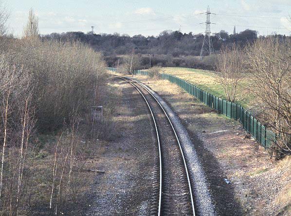 Cheadle Heath North Junction taken looking north from the A560 bridge in February 2005. This was the point at which the chord (still extant) down to Cheadle Junction (CLC) diverged from the MR main line. The main line route is marked by the grass bank visible between the fence and the pylon. It then crossed the River Mersey on a high iron viaduct and immediately after that, the CLC line was crossed by a separate bridge. The remains of the northern abutment of this bridge can just be made out either side of the lamp post in the centre.