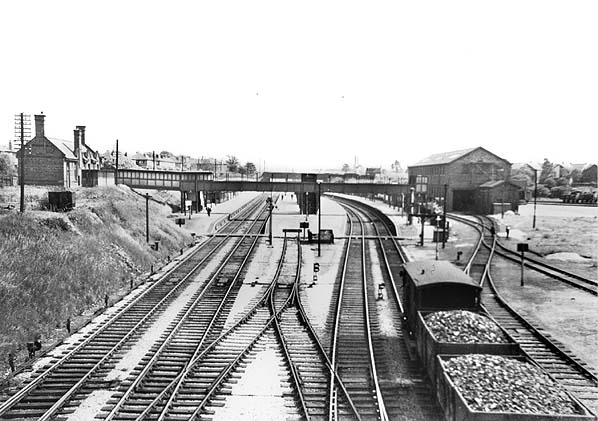 ![]() Looking south at Cheadle Heath Station in July 1946. The station's layout is clearly shown. A coal train is passing under the photographer along the line that will take it in the Liverpool direction.