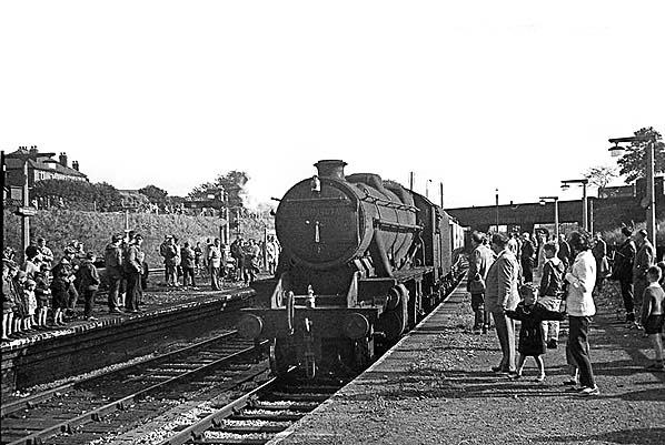 ![]() Looking south along platform 4 in 1965 as a goods train passes through. The crowds had turned out to see ex LNER A3 4472 Flying Scotsman call at the station on a railtour.