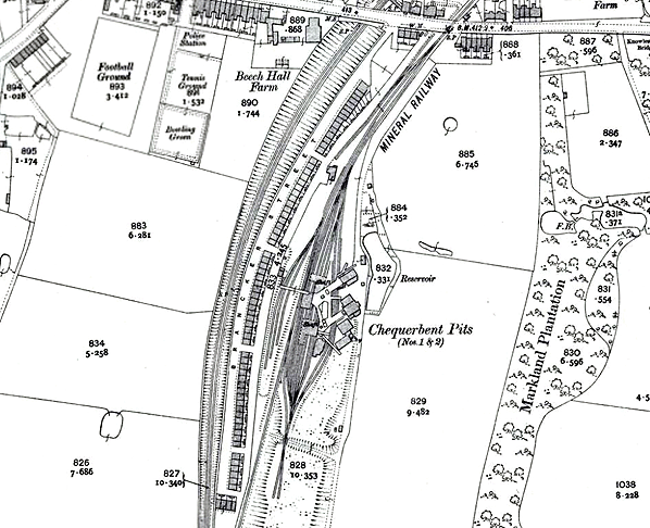 The Hulton Colliery Company Chequerbent Pits Numbers 1 and 2 shown on a 25-inch scale map from 1907. The pit closed in 1927 after the General Strike. The The original course of the B&L railway had been used to provide rail access to the pit. The 1885 alignment of the line can be seen to the right of the mine. After closure of the pit the original B&L line was retained for tipping purposes.