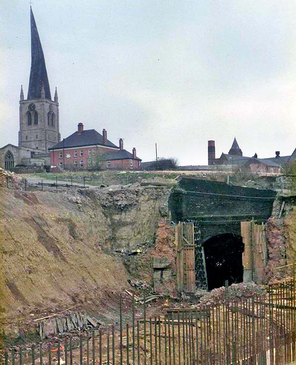 The south end of the tunnel c1984, during demolistion. Chesterfield Central station was at the other end of the tunnel. The photo shows the remains of the ventilation shaft three quarters along the tunnel. After the various foundations and retaining walls were completed for the Chesterfield Inner Relief road part of the ventilation shaft was strengthened with concrete and remains visible today.