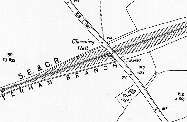 It was only with the introduction of rail-motors onto the branch in April 1906 that a permanent intermediate stopping place was provided. The site was the same as that used for the temporary station in 1892. It was not ideal being midway between the villages of Chipstead to the south and Chevening to the north, but it was hoped that it would serve a substantial catchment area. It was one mile south of Chevening Park, a large country house. In Bradshaw the halt was initially shown as Chevening Bridge Halt. (See August 1906 Bradshaw below)