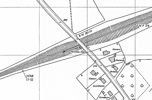 Chevening Halt comprised a timber platform on the down side, immediately west of the bridge carrying the Chipstead to Chevening road over the line. The halt was in a deep cutting, the only engineering work of any note on the line. Access was by a flight of steps from Chevening Road. At the top of the steps there was a wooden noticeboard with room for the station name at the top and a timetable and poster. A waiting shelter was set into the embankment at the bottom of the steps; this was of timber and concrete construction with a sliding wooden door and a corrugated asbestos pitched roof. The shelter might have been a later addition as it is not shown on 25-inch OS maps from 1907 and 1932 but is shown on the 1964 map below. Legend has it that the building at Chevening Halt was a common scene of assignations between local courting couples. Closing the sliding door revealed the names of couples written on the interior of the wall normally obscured by the door when in the open position. Unusually, considering its rural location, the station was lit by electricity, with lights on two tall timber poles. This lighting, seen in several photographs below, might have replaced earlier oil lighting.