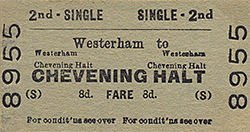 During the 1950s, the line began to suffer competition with buses, notably the 403 route which ran from Croydon via Sanderstead, Chelsham and Westerham to Sevenoaks, and as train fares rose dramatically from 1938, passenger numbers fell. In order to save running costs BR decided to work the line on the ‘one-engine-in-steam’ principle, using a miniature train staff under the control of the Dunton Green signalman. Brasted joined Chevening in becoming an unstaffed halt, and from 13 June 1955, there would no longer by any trains in the slack periods, although a Sunday service was retained during the summer months only. The branch thus became a ‘commuter line’ with Sunday being the only day of the week with a service throughout the day.