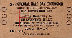 Unusually, the Westerham branch was not a regular destination for railtours in the 1950s but there was one, organised by the Inter-regional Ramblers' on 10 November 1957. The ‘Kentish Heights Special' ran from Greenford calling at all stations on the branch. It was scheduled to be hauled by the revived GWR 4-4-0, 'City of Truro' but on the day, it was hauled by Wainwright Class 0-1 No.31064. There was also a BR excursion from Kensington Olympia on 15 January 1957 but passengers for Westerham had to use the normal branch service from Dunton Green.