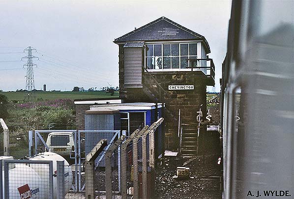 Photo by John Mann ![]() The signal box at the former Chevington station is observed from a northbound train in July 1983. The nameplate has been repainted in BR black-and-white ‘Corporate Identity’ livery.