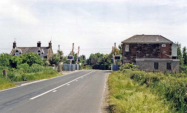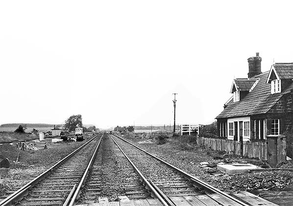 ![]() Looking north from the level crossing at Chevington in September 1978. The down and Amble bay platforms were formerly to the left of the railway tracks. The crossing cottages are to the right.
