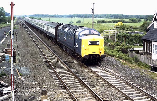 ![]() Station Name: CHEVINGTON![]() Deltic diesel 55007 ‘Pinza’ is passing the station site at Chevington on 24 June 1978 hauling the 09.00 Aberdeen to London Kings Cross service. The Newcastle & Berwick Railway crossing cottages are on the right, and several men can be seen on the site of the former down and Amble bay platforms. The loco was named after the 1953 Epsom Derby-winning stallion. Originally numbered D9007 it was withdrawn from service on 31 December 1981 and cut up at the BR Doncaster works in 1982.