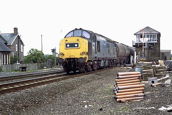 Photo by Keith Holt from the KDH Archive ![]() Class 37 diesel 37199 of Gateshead is on a down tanks train passing through the station site at Chevington on 24 June 1978. In this southward view the crossing cottages built by the Newcastle & Berwick Railway in 1847 are far left, and the gable end of a later railway cottage is beyond them. The NER signal box is to the right of the tracks.