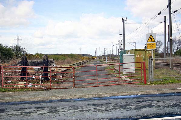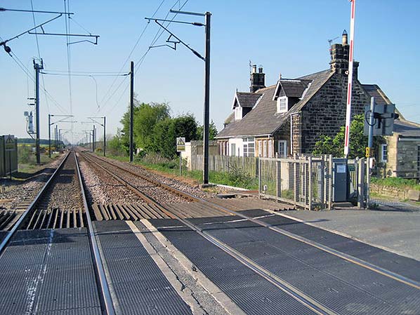 Photo by Steven Hedley from his Flickr photostream ![]() Looking north from the level crossing at Chevington in May 2010. The East Coast main line has been electrified. The crossing cottages are to the right, with the site of the down and Amble bay