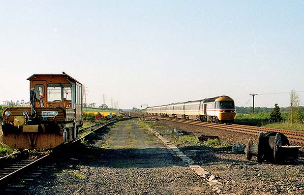 Photo by Ben Brooksbank ![]() In May 1988 an up (southbound) Inter-City 125 (Class 43) speeds towards the site of Chevington station. This view is from the trackbed of the line used by Amble branch trains until their withdrawal in 1930; the bay platform formerly stood immediately right of the photographer. A permanent way vehicle stands in the engineers’ siding.