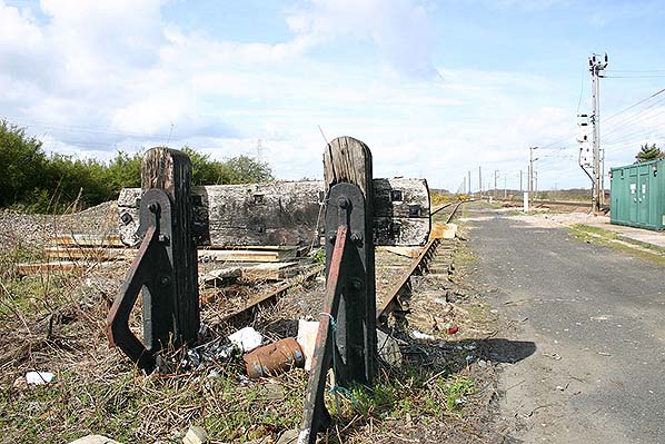 ![]() Station Name: CHEVINGTON![]() The buffer-stop of the permanent way engineers’ siding at Chevington, looking north in April 2005. The down and Amble bay platforms were formerly sited at the extreme right of this photograph.