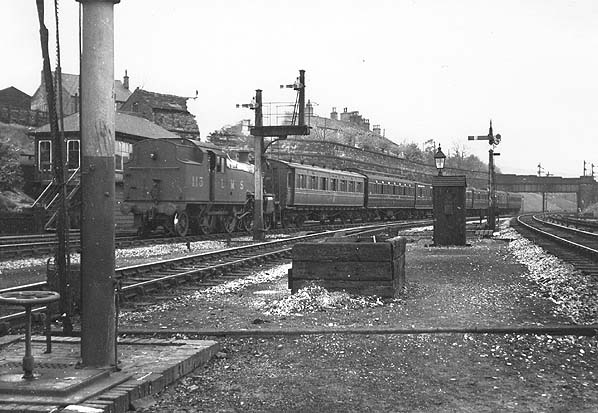 ![]() Looking east at the site of Chinley's first station as a local services passenger service arrives at the second station which is behind the photographer. The four rear coaches of the train are standing on the site of the former southbound platform which was swept away when the line was widened.