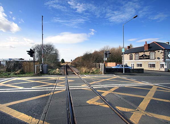 Looking west across the A10 level crossing towards the site of Choppington station in March 2009. Photo by John Mann