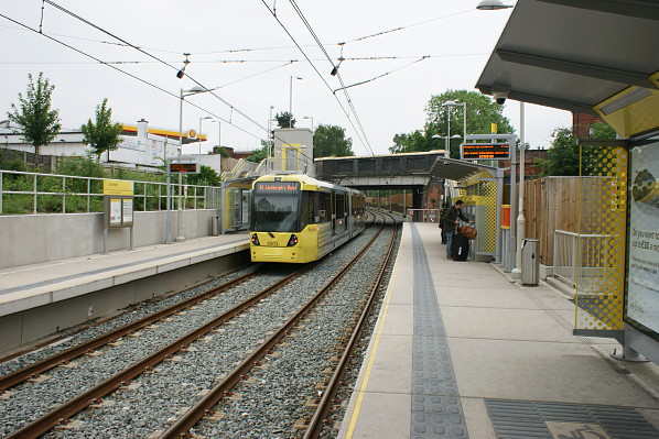 Looking south from the site of the former Manchester direction platform at Chorlton-cum-Hardy on 2 June 2012. Since 2011 the former Midland Railway line at Chorlton had been a Metrolink tram route. A tram stop called Chorlton had opened on what had been the southern end of the station.