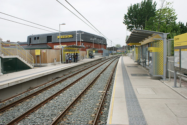 The site of Chorlton-cum-Hardy station looking north on 2 June 2012. The station site had been developed as a Metrolink tram stop as part of a new route that uses a section of the former Midland RailwaySouth District Line.